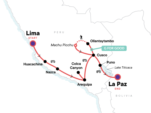 Your Local Living Moment: Lake Titicaca Homestay, Lake Titicaca. Sunset sandboarding & dune buggies (Huacachina). Pachamanca-style dinner (Nazca). Colca Canyon excursion. Guided tour of Machu Picchu. Inca Trail hike with a local guide, cook, and porters (4 days). G Adventures-supported handmade biodegradable soap products for use on the Inca Trail. Guided Lake Titicaca excursion. All transport between destinations and to/from included activities.