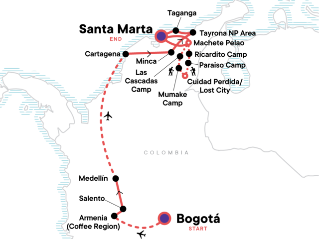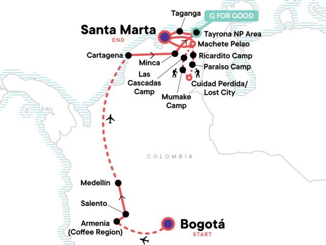 Discover the different neighbourhoods of Bogotá, Savour the tastes and aromas of Colombian coffee, Learn about the history of Medellín, Relax on the beach in Santa Marta, Hike to the Lost City, Spend time with the Gotshezhy Indigenous community, Discover the beauty in Tayrona National Park