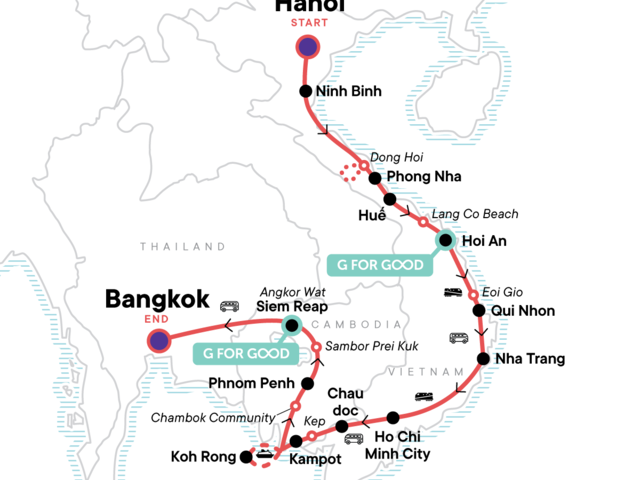 Enjoy street food crawls and free time in Hanoi and Ho Chi Minh City, Sample Oodles of noodles and visit riverside bars in Hoi An, Take a thrilling cyclo-tour trough Phnom Penh, Hit the beach at Qui Nhon and Koh Rong island, Descend into the remote Vinh Moc Tunnels, Explore the Mekong Delta and Sam mountain by motorbike, Embrace daily life at the floating markets of Chau Doc and not-so-daily life at Skun spider market, Join the street party in Bangkok