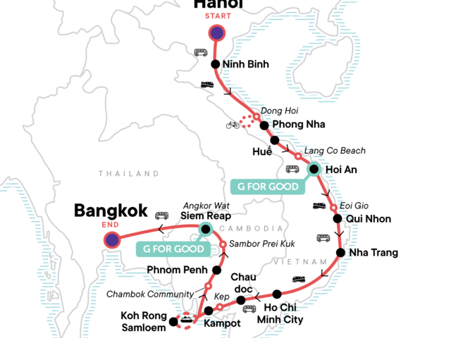 Your Foodie Moment: Ho Chi Minh City Street Food Crawl, Ho Chi Minh City. Hanoi Foodie Culture Tour. Tam Chuc Pagoda Tour. Dong Hoi Wet/Fish Market tour and countryside cycling. Vinh Moc Tunnels Tour. An Bang Cemetery Tour. Visit Lang Co Beach. Hai Van Pass and Marble Mountain Tour. Hoi An Old Town Walk and Riverside Evening Out. Dinner at one of the stylish restaurants in the ancient town of Hoi An. Thap Doi Cham Temples Visit. Eoi Gio Coastal Walk. Beach Time at Qui Nhon and Nha Trang. Visit Gành Đá Dĩa. Ho Chi Minh City Walking Tour including Ben Thanh Market. Karaoke Night. Motorbike tour including Hang Pagoda and Sam Mountain. Chau Doc floating market. Kep market walk. Tour of Monivong Bokor NP. Tour of Chambok Community with traditional lunch. Phnom Penh cyclo tour and dinner at one of best restaurants in Phnom Penh. Visits to Skun Market and Santuk Silk Farm. Tour of Sambor Prei Kuk Ancient Site. Visit Rong Klua Market. Visit Wat Sothorn Wararam Woraviharn. Walk and night out on Khao San Road. All transport between destinations and to/from included activities.