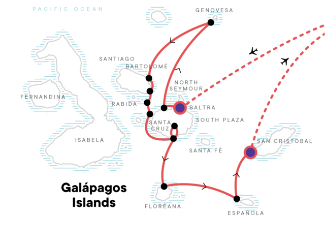 Flights to either of the airports in the Galapagos leave early in the morning on Day 2 and get you into the islands in the early afternoon. Flights back to the mainland depart between 10:00am and 1:30pm arriving in the early evening.