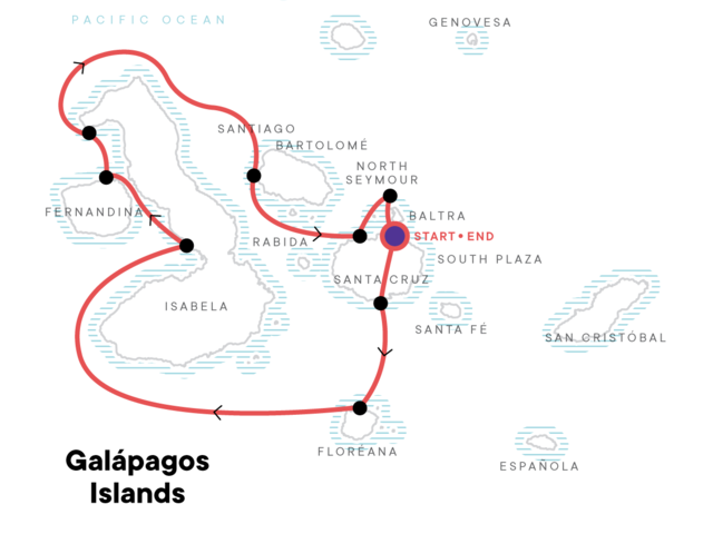 This tour starts at the Baltra Airport. For those arriving to Galapagos today, your flight should arrive to Baltra Island no later than 10:30am. Your CEO will be waiting for you with a G Adventures sign in the arrivals area of the airport. Once you meet the CEO and group at the airport, Staff will send your baggage to the boat directly, you won't have access to your checking baggage until you arrive at the boat around 6 PM and you will start with the first activity.