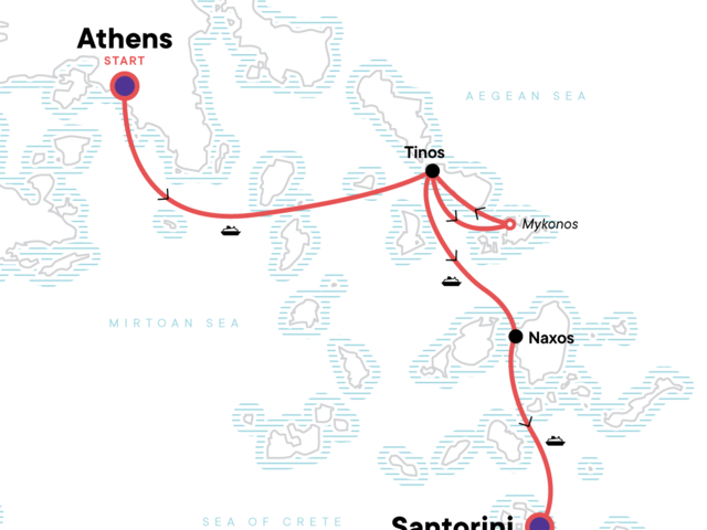 Your Welcome Moment: Welcome Moment - Meet Your CEO and Group. Island tour of Tinos. Free time in Tinos and Naxos. Day tour to Mykonos. Orientation walk in Naxos. Temple of Apollo visit. Caldera walk in Santorini. All transport between destinations and to/from included activities.