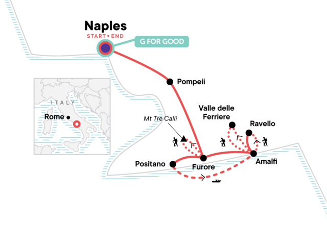 Your Welcome Moment: Welcome Moment - Meet Your CEO and Group. Guided tour of Pompeii. Organized hikes and excursions from Furore (6 days). Visit to Amalfi and Ravello. Scenic ferry ride from Positano to Amalfi. Cooking demonstrations at the agriturismo. Transport between destinations and included activities.