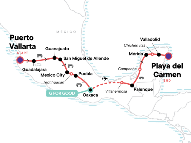 Your Discover Moment: Playa del Carmen. Guided tour of Teotihuacan. Orientation walk in Puebla. Orientation walk and market visit in Oaxaca.Guided tour of Palenque ruins site. Campeche visit. Orientation walk in Mérida. Guided tour of Chichén Itzá. Tequila distillery visit and tasting. City tour of Guadalajara. Orientation walk in San Miguel de Allende. City tour of San Miguel de Allende. Alebrijes Artisan Community Visit. Cooking demonstration with local expert in Oaxaca. Free time in Puebla, Oaxaca Puerto Vallarta, Playa del Carmen, Guadalajara, San Miguel de Allende, and Mexico City. All transport between destinations and to/from included activities.