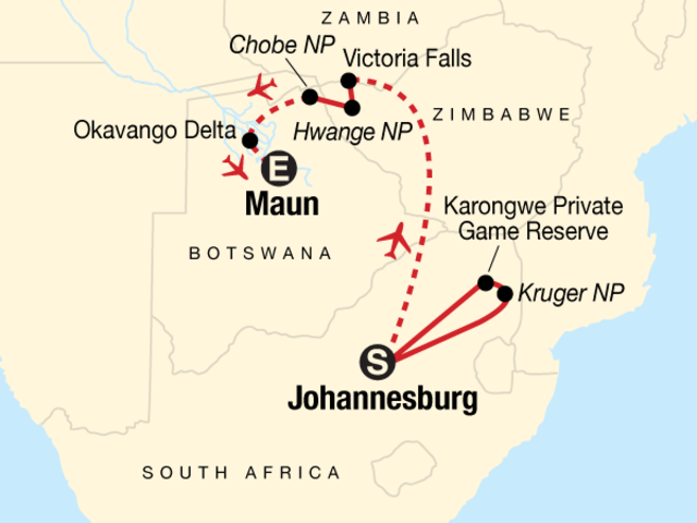 Your Discover Moment: Victoria Falls. Arrival transfer. Panorama Route scenic drive with entrances. Private nature reserve wildlife safari drives in open vehicles. Open-vehicle wildlife safari drives in Kruger, Hwange and Chobe National Parks. Tour of Victoria Falls. Chobe boat safari. Wildlife excursions by boat and on foot in the Okavango Delta. Internal flights. All transport between destinations and to/from included activities.