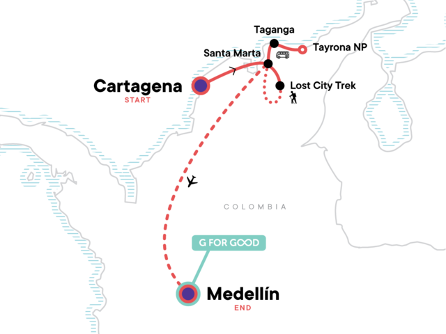Wander the historic walled city of Cartagena, Hike through the jungle to the Lost City of Teyuna, Venture up steep inclines of the Sierra Nevada Mountains, Explore the vibrant city of Medellin