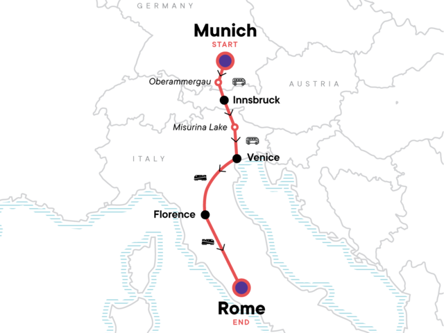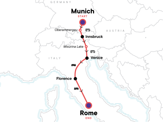 This tour includes some long travel days, but we believe those hours of travel are more than worth it for the reward of seeing so much of this breathtaking region in a short space of time, so unfold your map and get ready to enjoy some beautiful landscapes between Munich and Rome.