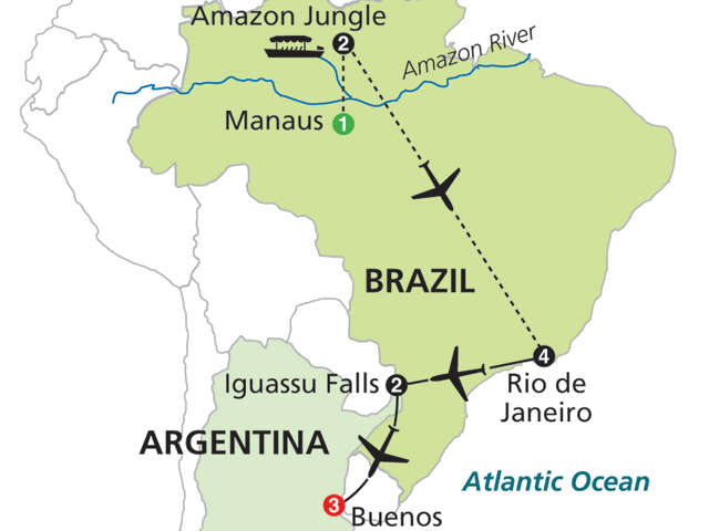 Venture to Brazil’s wondrous Amazon, then discover two of South America’s greatest cities, Rio de Janeiro and Buenos Aires, at a leisurely pace. Starting in Manaus, your Amazon adventure takes you to a local market and on a cruise along the Rio Negro to the Meeting of the Waters, where light and dark waters come together but never blend, showing a drastic contrast between these two great bodies of water. A monkey reserve and a visit to a local village to meet the residents who still make their life on the banks of the river will provide a full experience in the Amazon. Next, head to Rio, where you’ll have plenty of free time to explore and experience restaurants, shops, and optional excursions. View the iconic Christ the Redeemer statue on Corcovado Mountain; sip caipirinhas, a popular Brazilian cocktail; catch a Samba show; and enjoy famous Copacabana Beach for endless people watching! While in Buenos Aires, you’ll have the opportunity to visit the Cemetery of the Recoleta, where Eva Peron is buried, and learn how at the age of 33 she was declared the “Spiritual Leader of the Nation.” And no visit to Buenos Aires would be complete without a Tango show, the world’s most sensuous dance, in a city where romance permeates the air.A major highlight on this journey is a visit to Iguassu Falls in between your two city stays. It truly is one of the most spectacular sights on Earth. See the impressive falls from both the Brazilian and Argentine sides. Brazil’s view takes you through clouds of mist and the opportunity to see these 275 falls, spanning nearly two miles! Argentina’s side allows you to walk along the boardwalk network and embark on a jungle train through the forest for unforgettable views. Hear the deafening roar and admire the brilliant rainbows created by the clouds of spray, and take in the majesty of this wonder of the world.From vibrant cities to scenic beauty, this vacation to Rio de Janeiro, Iguassu Falls, and Buenos Aires will leave you with vacation memories you’ll cherish for life.