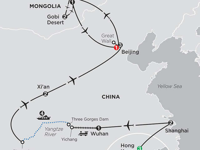 HONG KONGRide on Star Ferry; cable car ride to Victoria Peak; visit the dried seafood market; dim sum lunch; Host service during your staySHANGHAISightseeing with a Local Guide including headsets; visit Yu Yuan Gardens and the Shanghai MuseumWUHANVisit East Lake and the Hubei Provincial Museum; travel by bullet train from Wuhan to YichangYANGTZE RIVER CRUISEFour-night cruise through the Three Gorges, including a tour of the Three Gorges Dam Site, a boat excursion on Goddess Stream, and a walking tour in ShibaozhaiXI’ANSightseeing with Local Guide including headsets; visit the Terracotta Warriors, city wall, and a lacquerware factory; walking tour through Muslim quarterBEIJINGSightseeing with a Local Guide including headsets; visit Tian’anmen Square, the Forbidden City, and the Great Wall; Peking Duck dinnerULAANBAATARVisit the National History Museum, Sukhbaatar Square, Bogd Khan Winter Palace, Gandan Monastery, and Zaisan Hill; Mongolian folklore performance; Host service during your stayGOBI DESERTVisit Eagle Valley, Cemetery of Dinosaurs, and a camel breeders camp; Host service during your stay