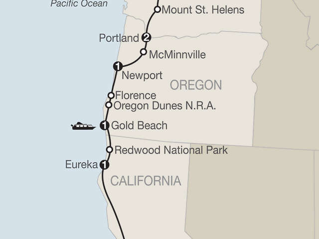 SEATTLE Sightseeing tour; visit the Space Needle and Boeing’s Future of Flight Aviation CenterMOUNT ST. HELENSVisit the Volcano Visitor’s Center PORTLANDSightseeing tour; visit the International Rose Test Gardens; visit to Mount Hood Winery with tasting and lunch; [LF] Taste of Portland tour MCMINNVILLEVisit the Evergreen Aviation Museum and Spruce Goose NEWPORTVisit and [LF] behind-the-scenes dinner at the Oregon Coast AquariumFLORENCEVisit Old Town and the Oregon Dunes National Recreation Area GOLD BEACHRogue River Jetboat ride REDWOOD NATIONAL PARK Sightseeing EUREKAVisit Redwood National Park; see the Carson Mansion SAN FRANCISCO Sightseeing; farewell dinner