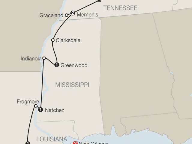 NASHVILLESightseeing with a Local Guide including a visit to Honky Tonk Row; visit the Country Music Hall of Fame; reserved seats at the Grand Ole Opry; [LF] visit and make a recording at RCA Studio BMEMPHISVisit Sun Studios and the Stax Museum of American Soul Music; sightseeing tour with a Local Guide; visit GracelandCLARKSDALEVisit the Delta Blues Museum; [LF] lunch at Morgan Freeman’s Ground Zero Blues Club; Rock & Blues MuseumGREENWOODOrientation tour including sites from the movie The HelpINDIANOLAVisit the B.B. King MuseumNATCHEZEnjoy a carriage ride with [LF] dinner at an antebellum mansionFROGMOREVisit a cotton plantation; Louisiana Delta Music MuseumLAFAYETTE[LF] Special program at Martin Accordions; cruise on the Atchafalaya BasinGREAT RIVER ROADGuided visit of Houmas House PlantationNEW ORLEANSSightseeing, New Orleans Jazz National Historic Park; farewell dinner