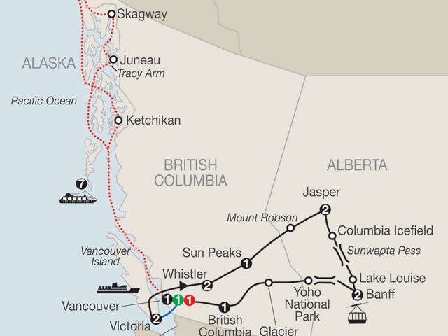 VANCOUVERCity sightseeing; farewell dinnerVANCOUVER–VICTORIAFerry ride through the Gulf IslandsVICTORIAOrientation tour; [LF] visit and dinner at Butchart GardensWHISTLERVisit Shannon Falls; [LF] breakfast at Squamish Lil’wat Cultural CentreJASPER NATIONAL PARK Sightseeing; cruise Maligne LakeCOLUMBIA ICEFIELD Ice Explorer ride on the Columbia IcefieldBANFF NATIONAL PARKGondola ride up Banff’s Sulphur MountainBRITISH COLUMBIA WINE COUNTRY[LF] Tour and wine pairing dinner at Summerhill Pyramid WineryCRUISE 7-night cruise aboard Holland America’s MS Nieuw Amsterdam