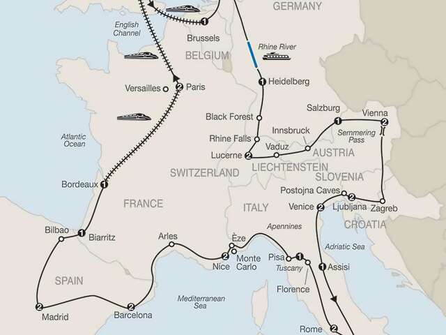 LONDONGuided sightseeing, visit St. Paul’s CathedralLONDON–BRUSSELS By high-speed Eurostar trainBRUSSELS Visit Grand’Place; [LF] enjoy a waffle and beer tasting at a local café; welcome dinnerAMSTERDAM Canal cruise; diamond centerRHINE CRUISEHEIDELBERGTake pictures of the castleBLACK FOREST Hear about the art of woodcarvingRHINE FALLSLUCERNEWalking tour including the Lion Monument and Chapel BridgeVADUZ Visit the capital of LiechtensteinINNSBRUCK Walk to the Golden Roof SALZBURG[LF] A special dinner at Farmhouse Lenzenbauer; guided walking tour, visit Mirabell Gardens and Residenz Square VIENNAGuided sightseeing, visit Heldenplatz and Cathedral Square; admire the unusual HundertwasserhausZAGREBGuided sightseeing; visit the cathedralLJUBLJANAGuided sightseeing, visit St. Nicholas’ Cathedral POSTOJNA[LF] Visit the Postojna Caves by mini-trainVENICEPrivate boat ride; guided walking tour, visit St. Mark’s Square & Basilica, Doges’ Palace and the Bridge of Sighs; glassblower demonstrationASSISIVisit St. Francis’ Basilica SORRENTO[LF] Excursion along the Amalfi Coast to Positano, taste a glass of Limoncello; excursion to Capri, including jetfoil boat ride, funicular ride, and guided sightseeingPOMPEIIGuided walking tour of the excavations ROME Guided sightseeing, visit the Vatican Museums and Sistine Chapel, St. Peter’s Square and Basilica, and the ColosseumFLORENCEGuided walking tour, visit Signoria Square; see Ponte Vecchio PISAMarvel at the legendary Leaning Tower ÈZEVisit a perfume factoryARLESWalk to the Roman AmphitheaterBARCELONAGuided sightseeing, visit the gothic quarter; take pictures of the Sagrada Familia BasilicaMADRIDGuided sightseeing, visit the Prado Museum BILBAOVisit the Guggenheim MuseumBIARRITZOrientation BORDEAUXOrientation drive BORDEAUX–PARISBy high-speed TGV train (first-class) PARISA special dinner at a local restaurant, ascend the Eiffel Tower and guided sightseeingPARIS-LONDONBy high-speed Eurostar TrainHeadsets throughout the tour