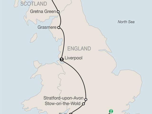 LONDON Welcome dinner; guided sightseeing; visit St. Paul’s CathedralSTONEHENGE Visit the prehistoric monumentBATH Visit the Roman relicsSTOW-ON-THE-WOLD Take a stroll in this Cotswolds villageSTRATFORD–UPON–AVON Visit Shakespeare’s birthplaceLIVERPOOL Visit the maritime cityGRASMERE Visit Wordsworth’s village; [LF] try original Grasmere GingerbreadEDINBURGH Guided sightseeing, visit Edinburgh Castle; farewell dinner at a local restaurant