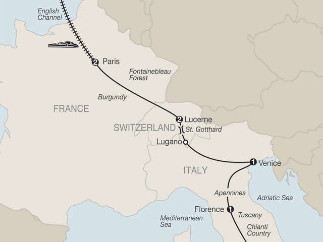ROMEWelcome dinner at a local restaurant; guided sightseeing, visit the Vatican Museums and Sistine Chapel, St. Peter’s Square and Basilica, and the ColosseumFLORENCEGuided walking tour, visit Michelangelo’s David and Signoria SquareVENICEPrivate boat ride; visit St. Mark’s Square; glassblower demonstration; [LF] pasta dinner at a local restaurantLUGANOStop at the lakesideLUCERNEWalking tour including the Lion Monument and the Chapel BridgePARISGuided sightseeing; ascend the Eiffel TowerPARIS-LONDONBy high-speed Eurostar train
