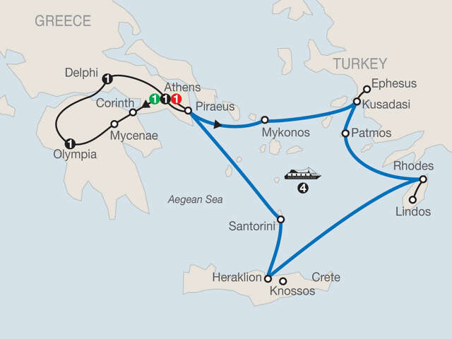 Take your escorted Greek vacation adventure further! Cruise the Greek Islands for four nights to experience the world-renowned Aegean Sea portion of the Mediterranean. Sail from Athens in an outside cabin aboard a Celestyal Cruise ship to the legendary island of Mykonos. Wander amid its iconic windmills and white houses. Next, you’ll sail towards the shores of Turkey to visit Kusadasi and the ancient excavations of Ephesus. Begin your crossing of the Aegean waters to the tiny Greek island of Patmos, then to the island of Rhodes. You’ll explore the clifftop acropolis of Lindos and Athena’s Temple. Next, dock at Heraklion on the island of Crete, where you can take an optional excursion to explore site of the 3000 BC Minoan civilization. You’ll also sail, weather permitting, to the panoramic and volcanic island of Santorini—“The Black Pearl of the Aegean.” Relax while basking in the beauty of the sea as you return to Athens for guided sightseeing. From the picturesque fishing villages to ancient historic sights and sailing the Aegean Sea, this guided tour of Greece has it all—including four spectacular nights on a Greek Island cruise.