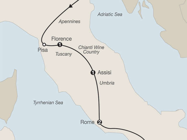 VENICE Welcome dinner at a local restaurant; private boat ride; guided walking tour, visit St. Mark’s Square, Doges’ Palace and the Bridge of Sighs; glassblower’s demonstrationPISA Marvel at the legendary Leaning TowerFLORENCE Guided walking tour, visit Michelangelo’s David and Signoria SquareASSISI [LF] Visit the Basilica of St. Francis with a friarROME Guided sightseeing, visit the Vatican Museums and the Sistine Chapel, St. Peter’s Square and basilica; dinner at a local restaurantPOMPEII Guided walking tour of the excavationsSORRENTO Farewell dinner