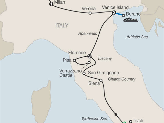 ROME [LF] Welcome dinner at the rooftop restaurant of your hotel overlooking Rome; guided sightseeing, visit the Vatican Museums and Sistine Chapel, St. Peter’s Square and Basilica, [LF] admire Michelangelo’s Moses in St. Peter in Chains; visit the Colosseum and Roman ForumSIENA Walking tour including Piazza del CampoSAN GIMIGNANO OrientationFLORENCE Guided walking tour, visit Michelangelo’s David and Signoria Square, and Santa Croce BasilicaPISA Marvel at the legendary Leaning TowerVERRAZZANO CASTLE [LF] Wine tasting and lunchBURANO Lagoon cruise and island visitVENICE Private water taxi ride by night; glassblower demonstration; private boat ride; guided walking tour, visit St. Mark’s Square and Basilica, Doges’ Palace and the Bridge of Sighs VERONA Walking tour including Juliet’s balcony and the ArenaMILAN Walking tour, visit the museum of La Scala Opera House and the Galleria; farewell dinner at a local restaurantLAKE MAGGIOREGuided sightseeing and boat ride to Isola Bella to visit the baroque palace and peacock gardensHeadsets throughout the tour