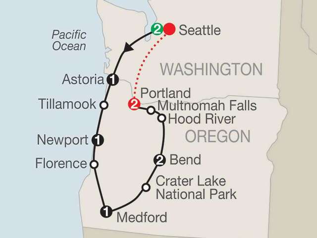 SEATTLE Sightseeing; tour & tasting at Redhook Ale Brewery ASTORIAVisit the Astoria Column and Fort Clatsop National Historic ParkTILLAMOOK Cape Mears State Park; tour the cheese factory and enjoy a local treatNEWPORT Tour with dinner & tasting at Rogue Brewery FLORENCE Explore the sand dunes on a dune buggy rideCRATER LAKE NATIONAL PARK SightseeingBEND [LF] Private guided tour at the High Desert Museum; lunch & tasting at Deschutes Brewery & Public HouseHOOD RIVEREnjoy a visit to a local orchard; lunch & tasting at Full Sail Brewing Co.MULTNOMAH FALLS SightseeingPORTLAND Sightseeing including a special coffee & chocolate tasting; special farewell [LF] brewers dinner at Widmer Brothers Brewing