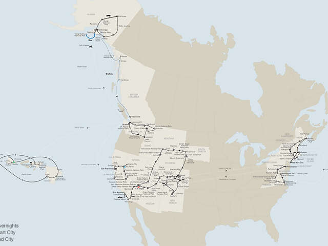 Breakfast daily (except day 14), 20 lunches including a box lunch in Denali National Park, 46 three-course dinners including a farewell dinner in Las Vegas
