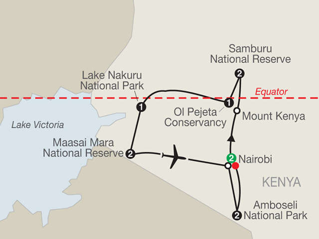 NAIROBI Visit the Sheldrick Elephant Orphanage, Karen Blixen Museum, and the Giraffe Center; Host service during your staySAMBURU NATIONAL RESERVE Three game drivesOL PEJETA CONSERVANCY Two game drives; visit a [LF] chimp sanctuaryLAKE NAKURU NATIONAL PARK Two game drivesMAASAI MARA NATIONAL RESERVE Three game drives; sundowner drinks; [LF] traditional Maasai dance performance; bush breakfastAMBOSELI NATIONAL PARK Three game drives; Driver/Guide service during your stayBottled Water Included on all game drives and with all meals