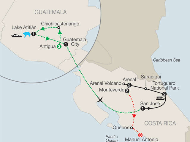 GUATEMALASightseeing in Antigua; visit a jade factory; stop in Chichicastenango to visit an open-air Indian market and the Church of Santo Tomás; cruise on Lake Atitlán; visit Santiago AtitlánCARIARITour a banana plantationTORTUGUERO NATIONAL PARKGuided cruise through the canals to view wildlife; guided walk through the rainforestARENAL [LF] Tour a pineapple plantation; sightseeing of La Fortuna town; visit Natura Park, [LF] Tabacón Hot Springs, and Arenal VolcanoMONTEVERDEVisit the Sky Walk hanging bridges; Santa Elena Cloud Forest; [LF] Trapiche Farm tour & home-hosted lunch; farewell dinnerSARCHI Shop for souvenirsMANUEL ANTONIOEnjoy three nights at the Hotel Parador Resort & Spa, just minutes from Manuel Antonio National Park