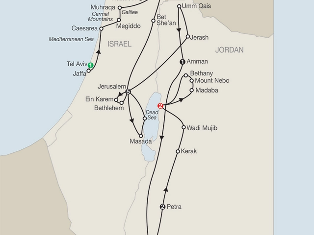 This wonderful vacation starts in Tel Aviv, Israel. Next, travel via Jaffa to Caesarea, with visits to the Roman amphitheater and the impressive Crusader fortress; the ancient fortified city of Megiddo; and Muhraqa to Tiberias at the Sea of Galilee, where you will stay for two nights. A morning excursion is included to Cana, site of the first miracle where Jesus changed water into wine at a wedding, and Nazareth, where you visit the Church of the Annunciation and St. Joseph’s Church. Afternoon is at leisure. On your way to Jerusalem, cruise on the Sea of Galilee, then visit the Mount of Beatitudes, Tabgha, and Capernaum, where Jesus recruited his first followers among the fishermen, a baptismal site on the river Jordan, and Bet She’an with its fine Roman and Byzantine relics. During your 5-night stay in Jerusalem, excursions are included to Ein Karem, Bethlehem, and the Garden Tomb, as well as to Masada, the Dead Sea, and a guided walking tour through the Old City. Visit the Mount of Olives, the Garden of Gethsemane, the Via Dolorosa, the Wailing Wall, and more. A full day at leisure to relax or to join an optional excursion featuring the Israel Museum with the Shrine of the Book and the Dead Sea Scrolls, and a visit to the Holocaust Memorial at Yad Vashem. On your final evening in Jerusalem, celebrate with your travel companions at a farewell dinner at your hotel. Next, travel via the Allenby Bridge, Jerash, the best-preserved Greco-Roman city in the Middle East, and Umm Qais to Amman, Jordan. On your way to the “rose-red city” of Petra, stop in Wadi Rum to experience a spectacular 4-wheel drive through the sand dunes and receive a keffieyeh, a local scarf. A full day of guided sightseeing includes a walk down the Siq, the narrow gorge made famous in the movie Indiana Jones and the Last Crusade. Admire the Treasury and sip tea in a Bedouin tent. Then, travel to the Dead Sea via Kerak and Wadi Mujib. Two nights here allow time for an included excursion to Madaba, Mount Nebo, where Moses saw the Promised Land, and Bethany Beyond the Jordan.