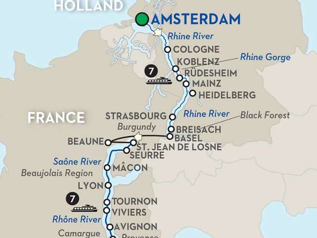 Day 1 Amsterdam (Embarkation): welcome receptionDay 2 Amsterdam: canal cruiseDay 3 Cologne: choice of Cologne highlights walking tour, or Jewish Heritage walking tourDay 4 Koblenz–Rhine Gorge–Rüdesheim: guided sightseeing in Koblenz; scenic cruise through the Rhine Gorge; visit Siegfried’s Mechanical Musical Instrument Museum in Rüdesheim; special treatDay 5 Mainz. Excursion to Heidelberg: guided walk, visit the Gutenberg Museum in Mainz; guided tour of Heidelberg Castle, see the Great VatDay 6 Strasbourg: guided sightseeing, visit La Petite France district and the gothic cathedral Day 7 Breisach. Excursion to Black Forest: choice of excursion to Black Forest, or guided tour in ColmarDay 8 Basel (Disembarkation)–Beaune–St. Jean de Losne (Embarkation)–Seurre: transfer to Beaune, visit the Hôtel-Dieu, or join a wine tasting in a local cellar; onboard welcome receptionDay 9 Seurre–Mâcon: leisurely cruising; onboard lecture about wine; free time in Mâcon or Chardonnay excursionDay 10 Lyon: onboard wine and cheese tasting; guided sightseeing; picture stop on Fourvière Hill Day 11 Lyon: a free day to explore this fascinating city at leisure, or excursion to Beaujolais; onboard food & wine pairing dinnerDay 12 Tournon/Tain l’Hermitage–Viviers: guided walk in Tournon with wine and chocolate tasting, or hike in the vineyeards (weather permitting); guided walk in Viviers, visit the Old Town and the cathedralDay 13 Avignon: guided sightseeing, visit Palace of the Popes and excursion to Châteauneuf du PapeDay 14 Arles: guided sightseeing in Arles, visit the Roman Amphitheatre; cruise into the Camargue region (daylight permitting)Day 15 Arles (Disembarkation)–Côte d’Azur: travel by motorcoach to Côte d’AzurDay 16 Côte d’Azur: your vacation ends this morning