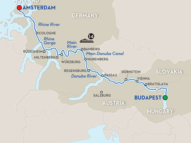 Cruise: deluxe 14-night cruise in an outside stateroom with Avalon’s exclusive Comfort Collection BedsSMDay 1 Budapest (Embarkation): welcome receptionDay 2 Budapest: guided sightseeing, see Fishermen’s Bastion and Heroes’ SquareDay 3 Bratislava: guided sightseeing, visit St. Martin’s CathedralDay 4 Vienna: guided sightseeingDay 5 Excursion to Göttweig Abbey–Dürnstein: guided visit of the Benedictine Abbey of Göttweig; guided walk in Dürnstein, see the Stiftskirche; wine tastingDay 6 Passau: guided walk in PassauDay 7 Regensburg: guided walk; enjoy a snack at the Historische Wurstküche; beer tastingDay 8 Nuremberg: choice of guided sightseeing or Nuremberg Rally Grounds tourDay 9 Bamberg: guided walk, see the Old TownDay 10 Würzburg: guided sightseeing, visit the Bishop’s ResidenzDay 11 Main River Village: guided walkDay 12 Rüdesheim–Rhine Gorge: visit Siegfried’s Mechanical Musical Instrument Museum; enjoy a special treat; cruise through the Rhine GorgeDay 13 Cologne: choice of guided walk or Jewish Heritage walkDay 14 Amsterdam: canal cruiseDay 15 Amsterdam (Disembarkation): your vacation ends this morning