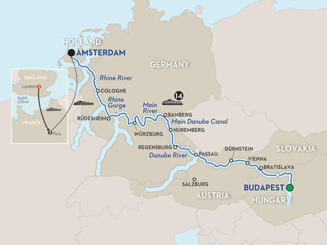 Cruise: deluxe 14-night cruise in an outside stateroom with Avalon’s exclusive Comfort Collection BedsSMDay 1 Budapest (Embarkation): welcome receptionDay 2 Budapest: guided sightseeing, see Fishermen’s Bastion and Heroes’ SquareDay 3 Bratislava: guided sightseeing, visit St. Martin’s CathedralDay 4 Vienna: guided sightseeingDay 5 Excursion to Göttweig Abbey–Dürnstein: guided visit of the Benedictine Abbey of Göttweig; guided walk in Dürnstein, see the Stiftskirche; wine tastingDay 6 Passau: guided walk in PassauDay 7 Regensburg: guided walk; enjoy a snack at the Historische Wurstküche; beer tastingDay 8 Nuremberg: choice of guided sightseeing or Nuremberg Rally Grounds tourDay 9 Bamberg: guided walk, see the Old TownDay 10 Würzburg: guided sightseeing, visit the Bishop’s ResidenzDay 11 Main River Village: guided walkDay 12 Rüdesheim–Rhine Gorge: visit Siegfried’s Mechanical Musical Instrument Museum; enjoy a special treat; cruise through the Rhine GorgeDay 13 Cologne: choice of guided walk or Jewish Heritage walkDay 14 Amsterdam: canal cruiseParis and London: 6 nights hotel accommodation with buffet breakfast (B); Monograms Local Host Service & Destination Guides with city maps; guided sightseeing, inside visits and special features are shown in UPPERCASE; high-speed Thalys train (firsit-class) from Amsterdam to Paris; high-speed Eurostar train (standard class*) from Paris to London (porterage available for one suitcase on Paris–London stretch only); transfers to/from train stations; discounts at the famous Galeries Lafayette department store in Paris.