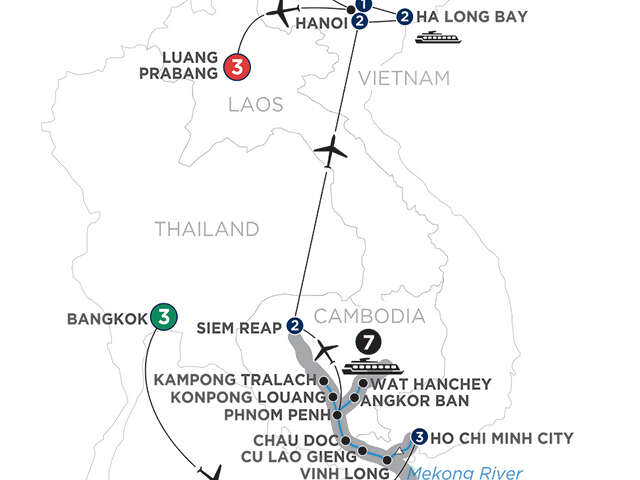 Day 1 Bangkok: Welcome to ThailandDay 2 Bangkok: Boat ride on klongs; visit the Grand Palace, Temple of the Emerald Buddha, and the Temple of the Reclining BuddhaDay 3 Bangkok: Day at leisureDay 4 Bangkok–Ho Chi Minh City: fly to Ho Chi Minh CityDay 5 Ho Chi Minh City: Walking tour; visit the famous Rex Hotel for a drink, War Remnants Museum, and Ben Thanh Market; cooking classDay 6 Ho Chi Minh City: Cu Chi Tunnels excursionDay 7 Ho Chi Minh City (Embarkation): Onboard welcome receptionDay 8 Vinh Long–Cu Lao Gieng: Visit a local workshop to see how rice paper, rice wine, and traditional candy are made in Vinh Long; visit a sampan-making family and interact with a Catholic priest in Cu Lao GiengDay 9 Chau Doc–Long Khanh A–Cambodian Border Crossing: Visit a local market and the religious sites at Sam Mountain in Chau Doc; walking tour of Long Khanh A with cotton-weaving demonstrationDay 10 Phnom Penh: Sightseeing by private cyclo, including the Royal Palace, Silver Pagoda, and the National Museum; afternoon at leisure; show by children from a local orphanage Day 11 Phnom Penh: Visit the Tuol Sleng Genocide Museum and visit one of the Cambodian Killing FieldsDay 12 Wat Hanchey –Angkor Ban: Visit Wat Hanchey and partake in a traditional water blessing by local monks; walking tour in Angkor Ban with school visitDay 13 Konpong Louang–Kampong Tralach: Visit the silversmith village of Konpong Louang; ox cart ride through the countryside, and visit a local farmer’s home in Kampong TralachDay 14 Phnom Penh (Disembarkation)–Siem Reap: Fly to Siem Reap; visit Angkor Wat, Angkor Thom, and Bayon TempleDay 15 Siem Reap: Visit Ta Prohm, Banteay Srei, and a noodle-making village; Apsara dance performanceDay 16 Siem Reap–Hanoi: Fly to HanoiDay 17 Hanoi: Visit Ho Chi Minh’s mausoleum, One Pillar Pagoda, and Temple of Literature; lunch at Koto; electric cart ride through the Old Quarter; water puppets performanceDay 18 Hanoi–Ha Long Bay (Embarkation): Drive to Ha Long Bay; visit Cua Van floating villageDay 19 Ha Long Bay: Cruise the bay; visit Ti Top Island, Luon Cave, and Dark and Bright Cave; opportunity to explore by kayakDay 20 Ha Long Bay (Disembarkation)–Hanoi: Visit Sung Sot Cave; drive to HanoiDay 21 Hanoi–Sapa: Drive to Sapa; visit a local marketDay 22 Sapa: Visit Ta Van village, Lao Chai village, Silver Waterfall, and Heaven GateDay 23 Sapa: Visit a weekly market and a Red Dao villageDay 24 Sapa–Hanoi–Luang Prabang: Drive to Hanoi; fly to Luang PrabangDay 25 Luang Prabang: Visit Mount Phousi, Wat Mai, the National Museum, and Wat Xieng Thong Day 26 Luang Prabang: Day at leisure Day 27 Luang Prabang: End of vacation