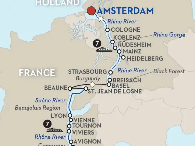 Day 1 Arles (Embarkation): welcome to France; onboard welcome reception; cruise into the Camargue region (daylight permitting)Day 2 Arles: guided sightseeing, visit the Roman Amphitheater; evening jazz band entertainmentDay 3 Avignon: guided sightseeing, visit the Palace of the PopesDay 4 Cruising–Viviers: guided walk, visit Old Town and the cathedralDay 5 Tournon/Tain l’Hermitage–Vienne: guided walk in Tournon; onboard jazz music entertainment, guided walk in Vienne; free time to visit the Vienne Jazz FestivalDay 6 Lyon: guided sightseeing, picture stop on Fourvière Hill; onboard lectureDay 7 Cruising–St. Jean de Losne: day at leisure; cheese tasting; onboard jazz entertainmentDay 8 St. Jean de Losne (Disembarkation)–Beaune–Basel, Switzerland (Embarkation): visit the Hôtel-Dieu in Beaune; transfer to Basel; onboard welcome receptionDay 9 Breisach: Excursion to the Black Forest, visit a woodcarver’s workshop or visit a Black Forest open-air museumDay 10 Strasbourg: guided sightseeing, visit La Petite France district and the gothic cathedralDay 11 Excursion to Heidelberg–Mainz: guided visit of the castle, see the Great Vat in Heidelberg; visit the Gutenberg Museum in MainzDay 12 Rüdesheim–Rhine Gorge–Koblenz: visit Siegfried’s Mechanical Musical Instrument Museum and enjoy a special treat in Rüdesheim; cruise through the Rhine Gorge; guided walk in KoblenzDay 13 Cologne: choice of guided city walk or Jewish Heritage walkDay 14 Amsterdam: canal cruiseDay 15 Amsterdam (Disembarkation): your vacation ends this morning