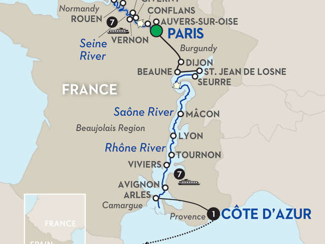 Cruise: deluxe 14-night cruise in an outside stateroom with Avalon’s exclusive Comfort Collection BedsSMDay 1 Paris (Embarkation): welcome receptionDay 2 Vernon–Les Andelys: choice of excursions to Giverny or Bizy Castle; guided walk in Les AndelysDay 3-4 Caudebec: choice of excursion along either the “Normandy Villages Route” or the “Normandy Abbeys Route”; choice of excursions to Normandy landing beaches or “A Taste of Normandy”Day 5 Rouen: guided sightseeing, see the Astronomical Clock and visit the cathedral or guided sightseeing focused on the French resistance; onboard lectureDay 6 Conflans: choice of excursions: visit Auvers-sur-Oise or Château de MalmaisonDay 7 Paris: choice of guided sightseeing or “Heart of Paris” walk; in the afternoon included visit at Museum of the Order of the LiberationDay 8 Paris (Disembarkation)–Beaune–St. Jean de Losne (Embarkation)–Seurre: Transfer to Beaune, visit Hôtel-Dieu; onboard welcome receptionDay 9 Seurre–Macon: leisurely cruising; free time in Macon; cheese tastingDay 10 Lyon: guided sightseeing; picture stop on Fourvière HillDay 11 Lyon: a day to explore this fascinating city at leisureDay 12 Tournon/Tain l’Hermitage–Viviers: guided walk in Tournon; guided walk in Viviers, visit the Old Town and the cathedralDay 13 Avignon: guided sightseeing, visit Palace of the PopesDay 14 Arles: sail into the Camargue region (daylight permitting); guided sightseeing in Arles, visit the Roman Amphitheater Day 15 Arles (Disembarkation)–Côte d’Azur: travel by motorcoach to Côte d’Azur Barcelona: 3 nights hotel accommodation with buffet breakfast (B); Monograms Local Host Service & Destination Guide with city map; guided sightseeing, inside visits and special features are shown in UPPERCASE; flight Nice-Barcelona with transfers.