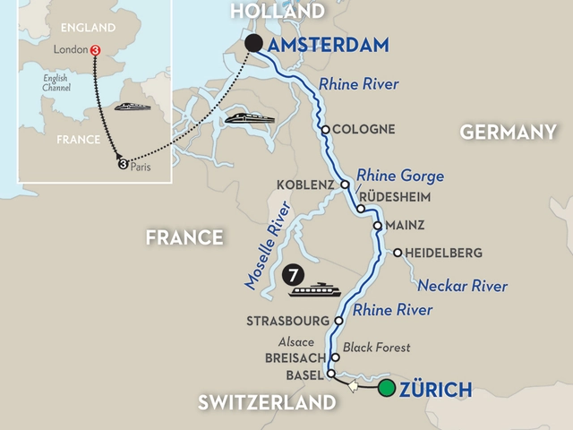 Cruise: deluxe 7-night cruise in an outside stateroom with Avalon’s exclusive Comfort Collection BedsSMDay 1 Zürich–Transfer to Basel (Embarkation): onboard welcome receptionDay 2 Breisach. Excursion to the Black Forest: visit a woodcarver’s workshop or visit a Black Forest open-air museumDay 3 Strasbourg: guided sightseeing, visit La Petite France district and the gothic cathedralDay 4 Excursion to Heidelberg–Mainz: guided visit of the castle, see the Great Vat in Heidelberg; visit the Gutenberg Museum in MainzDay 5 Rüdesheim–Rhine Gorge–Koblenz: visit Siegfried’s Mechanical Musical Instrument Museum in Rüdesheim and enjoy a special treat; cruise through the Rhine Gorge; guided walk in KoblenzDay 6 Cologne: choice of guided city walk or Jewish Heritage walkDay 7 Amsterdam: canal cruiseParis & London: 6 nights hotel accommodation with buffet breakfast (B); Monograms Local Host Service & Destination Guides with city maps; guided sightseeing, inside visits and special features are shown in UPPERCASE; high-speed Thalys train (first-class) from Amsterdam to Paris; high-speed Eurostar train (standard class*) from Paris to London (porterage available for one suitcase on Paris–London stretch only); transfers to/from train stations; discounts at the famous Galeries Lafayette department store in Paris.