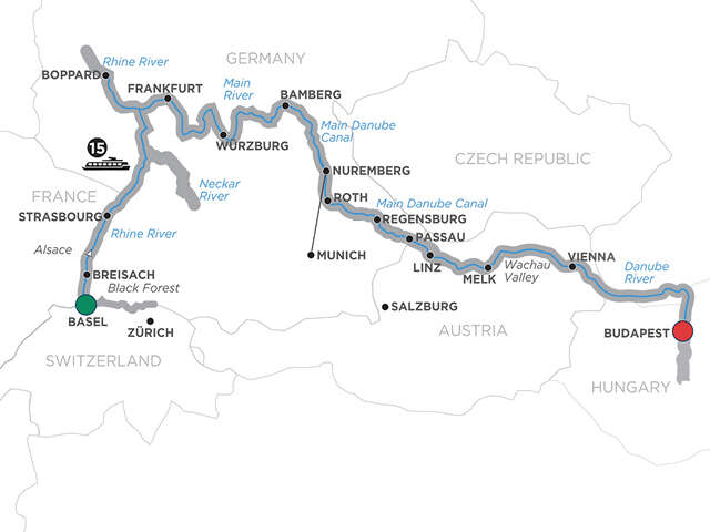 Day 1 Basel (Embarkation): onboard welcome reception Day 2 Breisach. Excursion to Black Forest: choice of excursion to Black Forest, or guided tour in Colmar Day 3 Strasbourg: guided tour, visit to La Petite France district and the gothic cathedral, local beer tasting; onboard beer lectureDay 4 Rüdesheim–Rhine Gorge–Boppard: choice of visit to Siegfried’s Mechanical Musical Instrument Museum, or cable car ride to the Niederwald Monument in Rüdesheim; special treat; scenic cruising through the Rhine Gorge; time at leisure in BoppardDay 5 Frankfurt:onboard beer tasting; choice of guided tour in Frankfurt, or guided tour in SeligenstadtDay 6 Main River Village: guided walking tour, onboard food and beer pairing dinner Day 7 Würzburg: guided tour, visit to the Bishop’s Residenz, taste a local beerDay 8 Bamberg: guided tour, see the Old Town Hall; visit a malt factory or a hop gardenDay 9 Nuremberg. Excursion to Munich: full day guided tour in MunichDay 10 Roth. Excursion to Nuremberg: choice of Nuremberg guided tour, or Nuremberg Rally Grounds tour; lecture on boardDay 11 Regensburg: guided walk; beer tasting on boardDay 12 Passau: guided walkDay 13 Melk–Wachau Valley–Vienna: guided tour of the Benedictine Abbey in Melk; scenic cruising through the Wachau ValleyDay 14 Vienna: guided sightseeingDay 15 Budapest: guided tour, see Heroes’ SquareDay 16 Budapest (Disembarkation): your vacation ends this morning