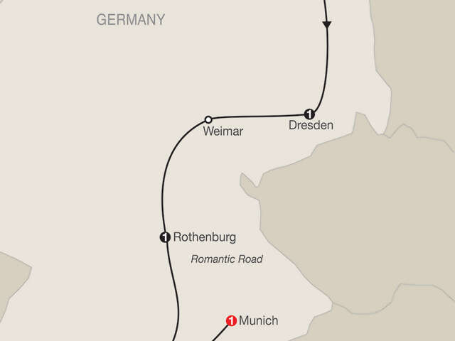 BERLINWelcome dinner; guided sightseeing, visit Kaiser Wilhelm Memorial Church, picture stop at Brandenburg Gate & Holocaust MemorialDRESDENGuided sightseeing, visit the Courtyard of Zwinger PalaceWEIMAROrientationROTHENBURG[LF] Stay overnight in the medieval townNEUSCHWANSTEIN[LF] Guided visit of King Ludwig’s castleOBERAMMERGAUPassion PlayMUNICHOrientation drive, visit Marienplatz; [LF] farewell dinner in the beer garden of a local restaurant