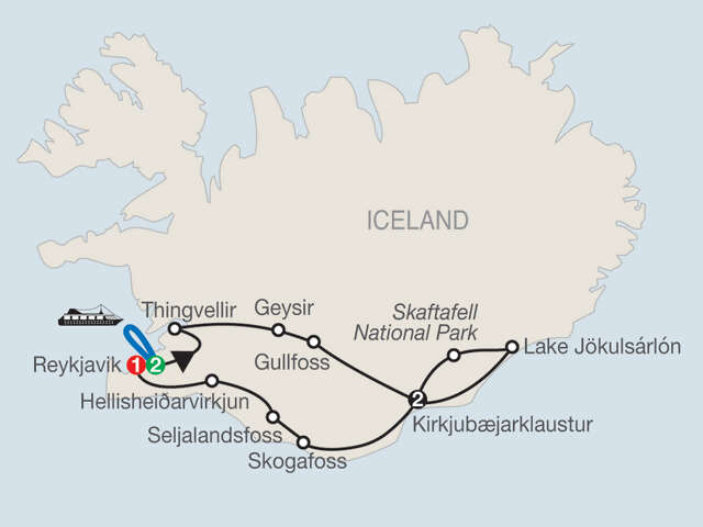 REYKJAVIK Welcome dinner; orientation; see the Northern Lights; farewell dinner at a local restaurantTHINGVELLIR[LF] Walk through the rift valley that marks the separation between the North American and the European tectonic platesGEYSIR Admire the hot springs; [LF] taste local specialties and drink a glass of schnappsGULLFOSS [LF] Marvel at the waterfallSKAFTAFELLDrive through the national parkLAKE JÖKULSÁRLÓN [LF] See the setting of James Bond’s Die Another Day and see the largest glacier in EuropeSKOGAFOSS & SELJALANDSFOSS Admire the WaterfallsHELLISHEIÐARVIRKJUNVisit the geothermal heat and electric power station