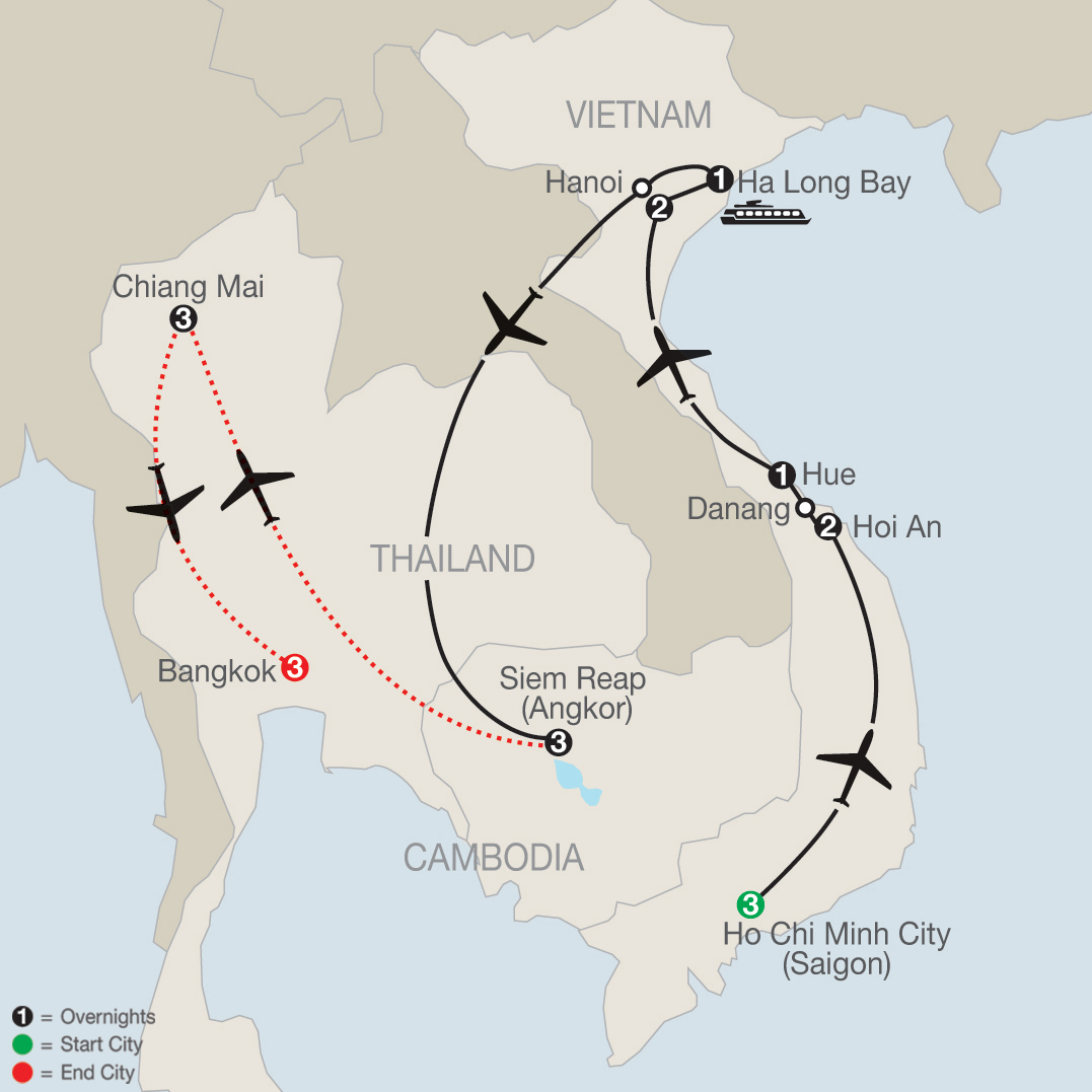 HO CHI MINH CITY Sightseeing with a Local Guide; Cu Chi Tunnels excursion; walking tour of the city’s landmarks; visit the War Remnants Museum, and Ben Thanh Market; welcome dinnerDANANGSightseeing with a Local Guide; visit China Beach and the Cham MuseumHOI AN Sightseeing with a Local Guide; cruise on the Thu Bon River; [LF] fishing lesson with a local fisherman; walking tour of the city; visit an old merchant house, the Hoi An Museum, and a Chinese assembly hallHUESightseeing with a Local Guide; visit the Imperial Citadel, Thien Mu Pagoda, Tombs of Nguyen Emperors, Khai Dinh Mausoleum, and Royal Tomb of Tu DucHANOISightseeing with a Local Guide; visit the Ho Chi Minh Mausoleum, One Pillar Pagoda, Ho Chi Minh Museum, Temple of Literature, and Hanoi Hilton; [LF] take a “cyclo” ride; walking tour in the Old Quarter; [LF] water puppets performanceHA LONG BAYOvernight cruise on the baySIEM REAP Sightseeing with a Local Guide; visit Angkor Wat, Angkor Thom, Bayon Temple, Banteay Srei, and Ta Prohm; [LF] Apsara dance performanceCHIANG MAISightseeing with a Local Guide; visit Wat Phra Singh, Wat Doi Suthep, an elephant training camp, and an orchid farm; Host service during your stayBANGKOK Sightseeing with a Local Guide; visit the Grand Palace, Temple of the Emerald Buddha, and the Temple of the Reclining Buddha; Host service during your stay